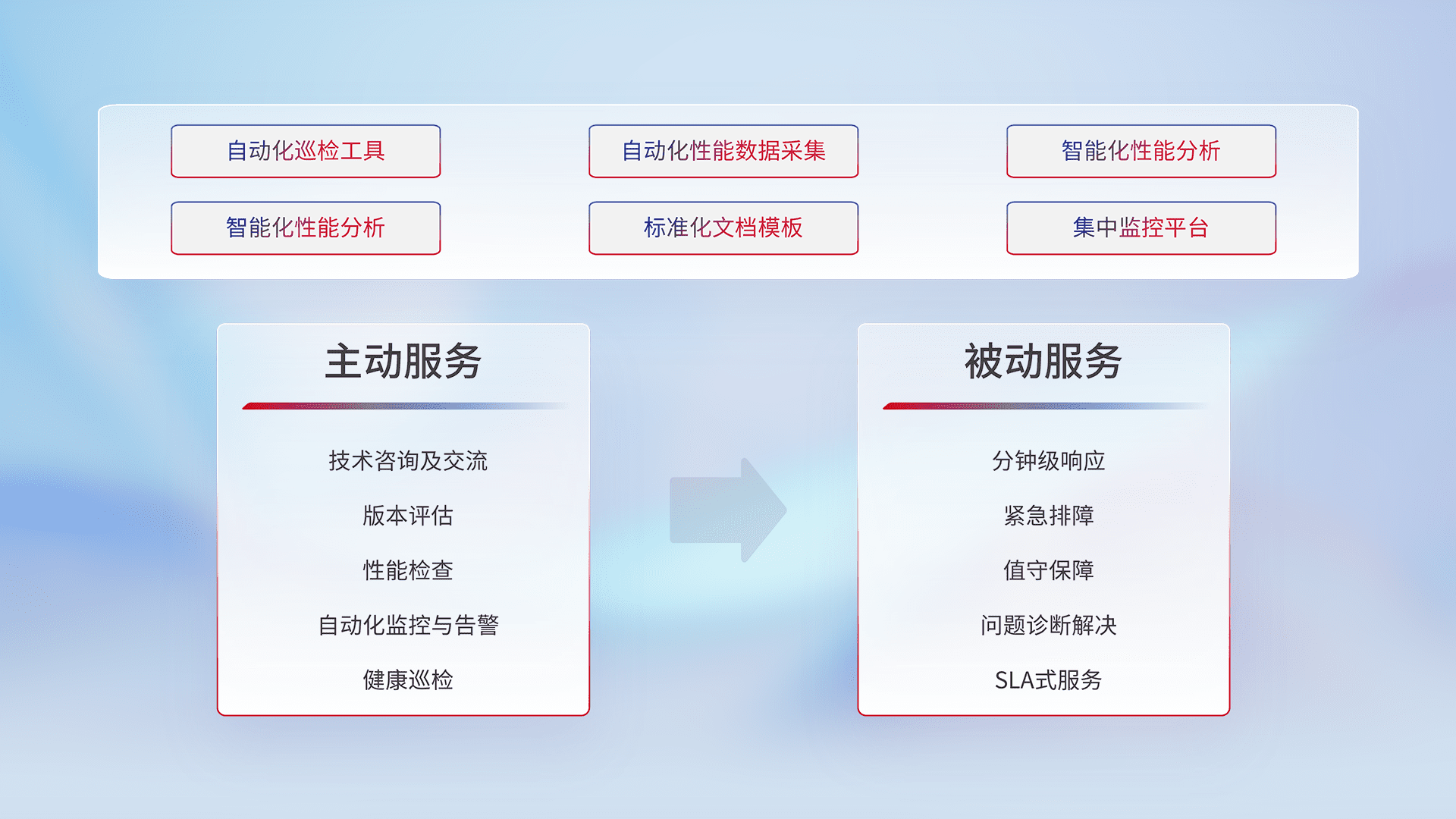 智能化工具和标准化文档,,,,保障服务质量,,提供主动服务(包含技术咨询、、版本评估、、、、性能检查、、、自动化监控与告警、、、、健康巡检)和被动服务包含(分钟级响应、、紧急排障、、、值守保障、、、问题诊断解决、、、、SLA服务)。。